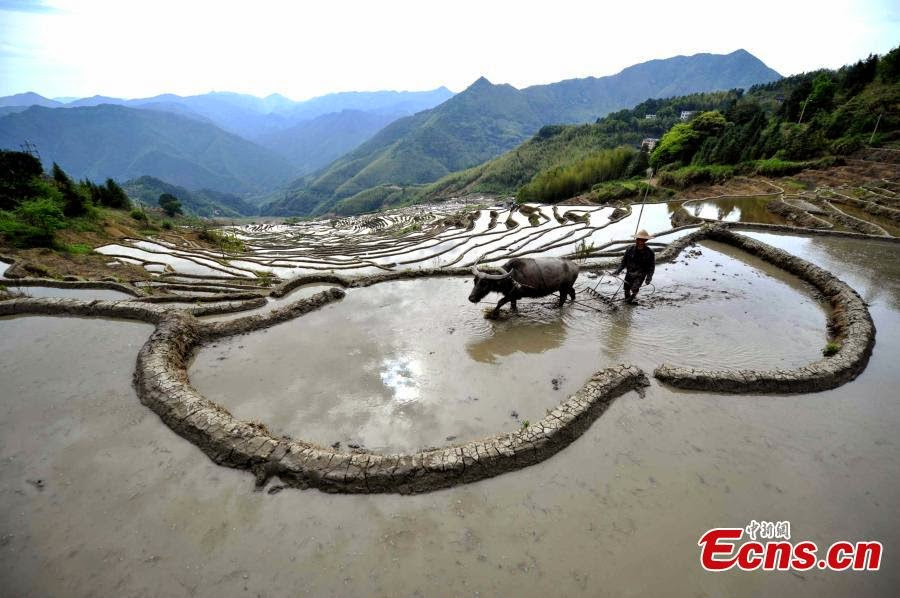A farmer ploughs a terraced field with a cow at Lianhe township, Youxi county, Fujian province